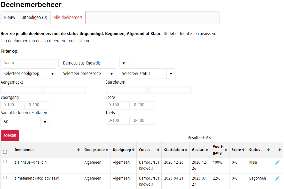 Hier zie je ook de status en voortgang van deelnemers, eventueel scores en toetscertificaten.