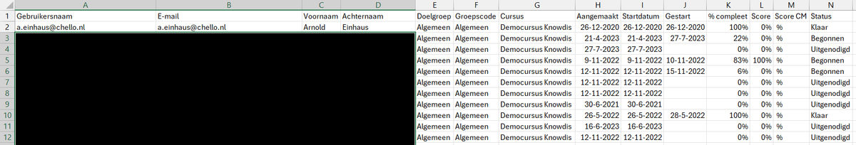 Begonnen: Deelnemer heeft ingelogd, onder voortgang kun je zien hoever hij/zij in de cursus is.