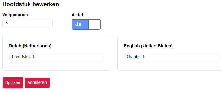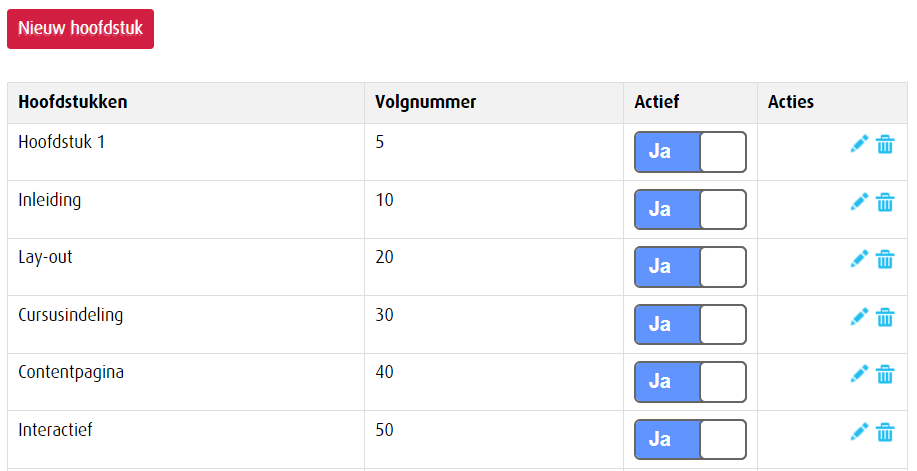 Als je een hoofdstuk op 'niet actief' zet, geldt dat ook voor alle contentpagina's binnen dat hoofdstuk. 'Niet actief' is niet hetzelfde als verwijderd: je kunt een hoofdstuk altijd weer wijzigen en/of activeren.