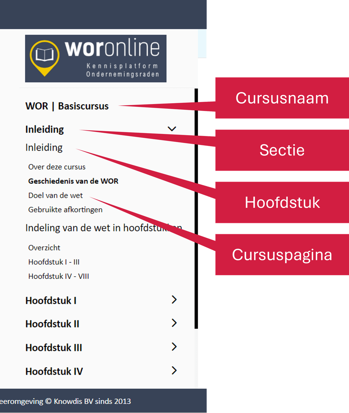 Secties vormen de hoogste indeling binnen een cursus, met daaronder hoofdstukken en daaronder contentpagina's. De deelnemer ziet secties, hoofdstukken en contentpagina's in het navigatiemenu.