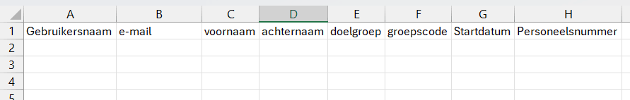 Hieronder zie je de velden die in het CSV importbestand staan. Je vult voor elke deelnemer alle velden in (behalve personeelsnummer, die is optioneel en mag leeg blijven) We lopen de velden één voor één door.