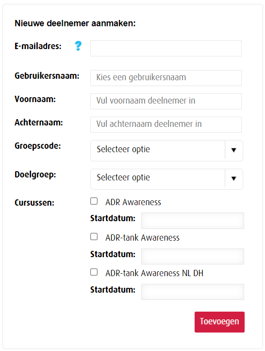 Gebruikersnaam: zie boven op deze pagina, hier geldt hetzelfde als bij het individueel aanmaken van een deelnemer. Meestal gebruiken we hier dus ook het e-mail adres.