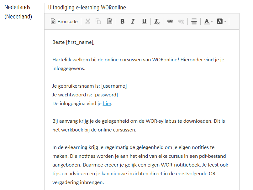 Voor uitnodigingen geldt dat een deelnemer tenminste de autotext-elementen [url] (van de cursus), [username] en [password] moet ontvangen om te kunnen inloggen. Deze velden moet je dus altijd laten staan.