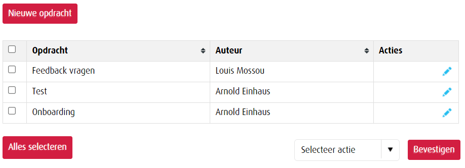 Als je een opdracht wilt bewerken, klik dan op het blauwe pennetje rechts. Een nieuwe opdracht aanmaken brengt je in eenzelfde scherm, maar dan uiteraard nog leeg.