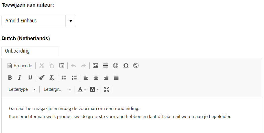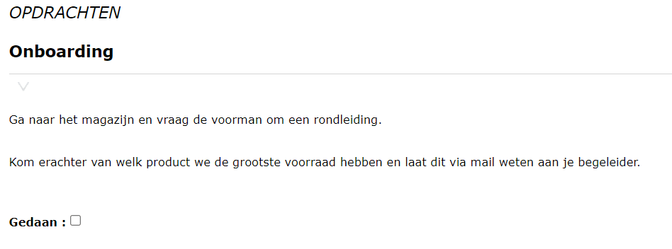 Je kunt hier eenvoudige opdrachten geven die de deelnemer zelf afvinkt. Denk aan onderdelen van een onboarding programma, maar je kunt hierme ook opdrachten maken waarin je om bewijs vraagt; een rapportje bijvoorbeeld.