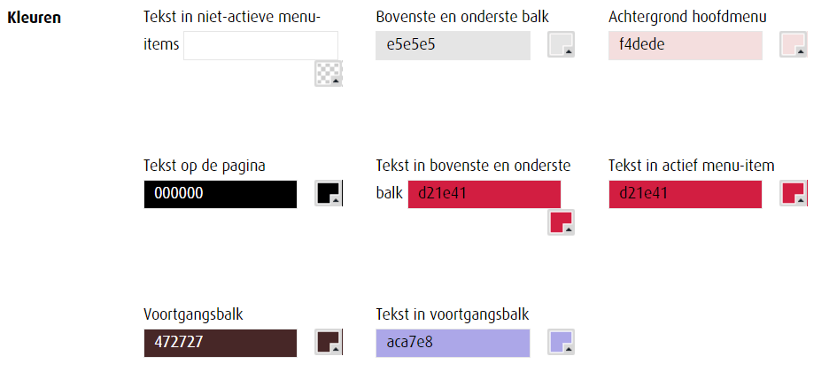 Gebruik de kleurenselector naast elk van de acht instelbare pagina-elementen om de juiste kleuren in te stellen.
