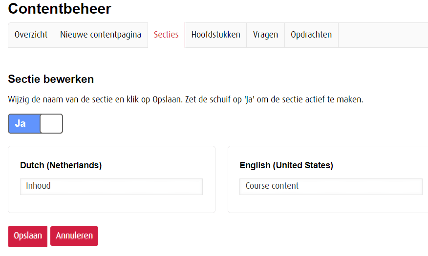 Let op: als je een extra sectie activeert, dan moet je er tenminste één hoofdstuk met één contentpagina in onderbrengen, met de status Open.