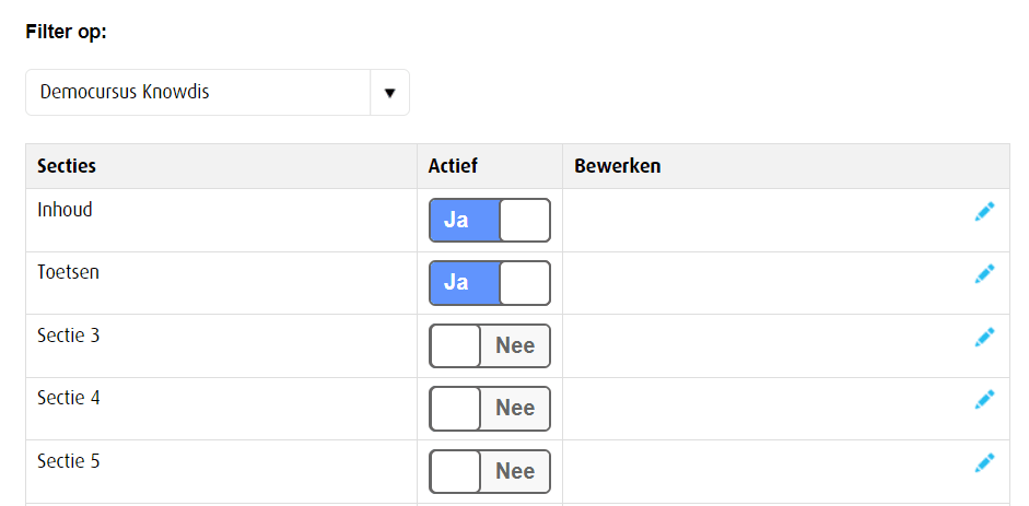 Secties zijn gekoppeld aan een cursus, zorg dus dat je eerst de juiste cursus selecteert. Secties hebben geen nummering, de volgorde in dit scherm bepaalt de volgorde in je cursus.