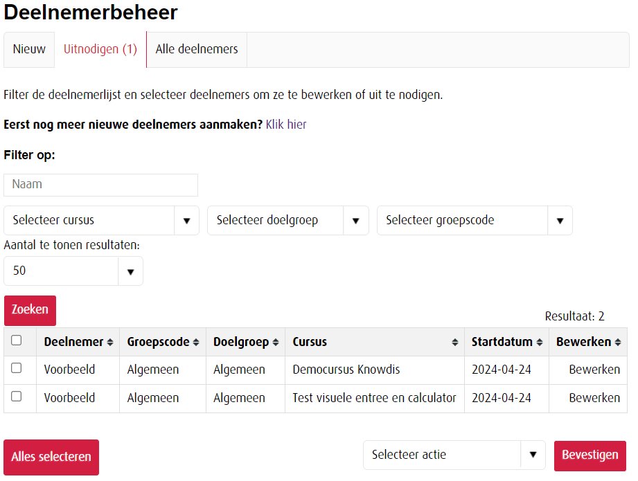 Als je op de tab Uitnodigen klikt zie je bovenaan dit overzicht met filters. Merk op dat in de tab zelf het aantal uit te nodigen deelnemers staat, terwijl in het overzicht een regel voor elke deelnemer-cursus combinatie te zien is.