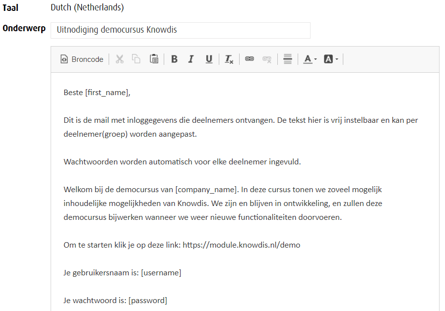 Je ziet hier altijd de tekst uit je mailsjabloon staan. Die kun je gewoon gebruiken als die goed is, je kunt de tekst voor de deelnemer(s) die je nu gaat uitnodigen ook aanpassen.