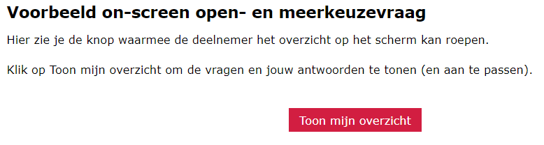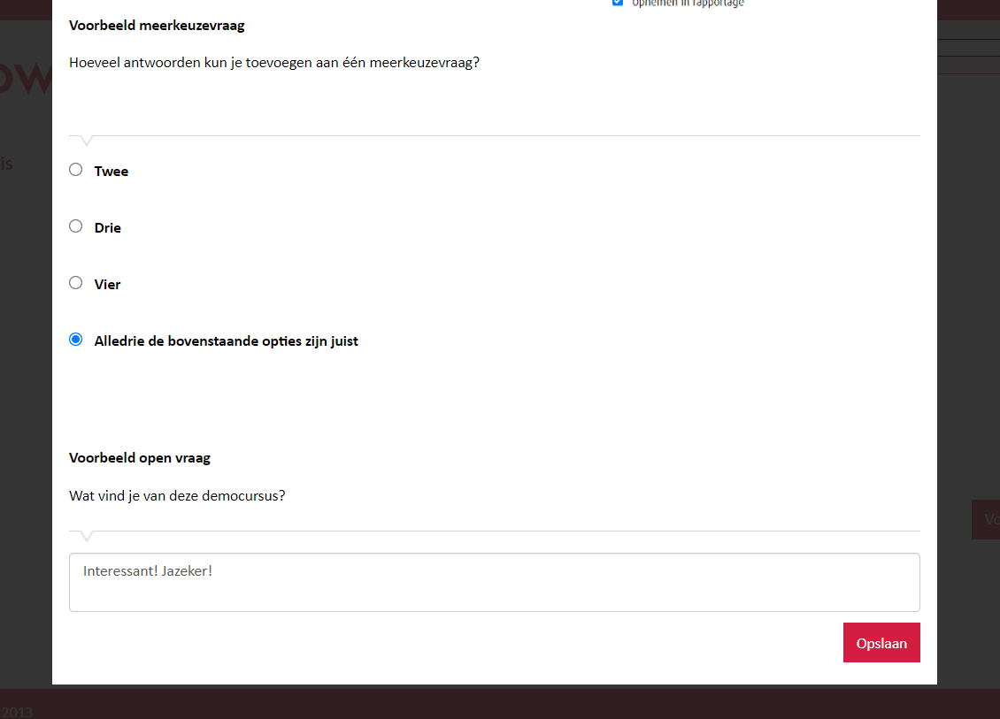Opnemen in mijn overzicht zorgt dat deze vraag meegaat in het overzicht dat de deelnemer later kan openen en aanpassen. NB: Ergens in de cursus moet nog de knop 'Toon antwoorden' worden opgenomen!