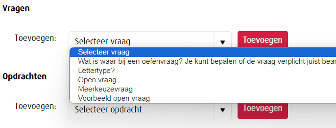 Klik op het veld Selecteer vraag, dan komen alle vragen die je gemaakt hebt tevoorschijn. Kies een vraag en klik op Toevoegen.