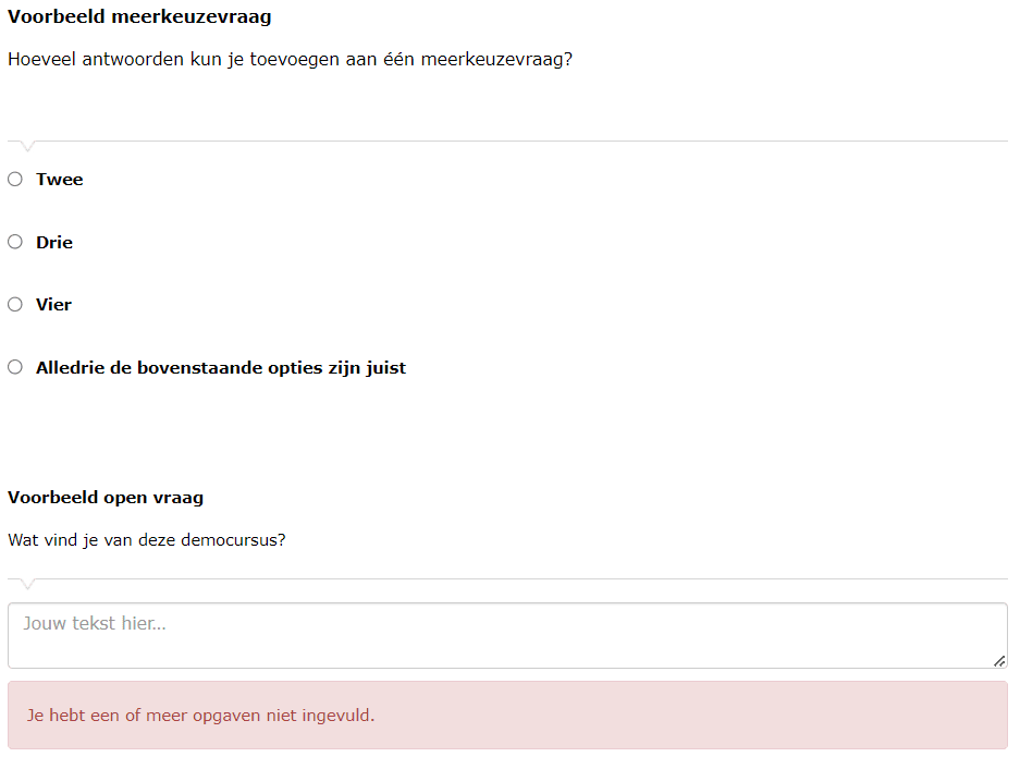 - Inline vragen: eenvoudige open of meerkeuze vragen voor zelftesten, notities of evaluaties