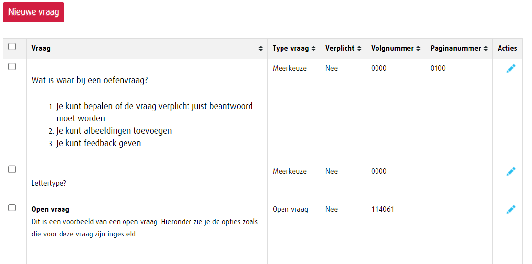 Je kunt een nieuwe vraag maken of vragen bewerken door op het blauwe potloodje te klikken. In beide gevallen opent dan het bewerkingsscherm.